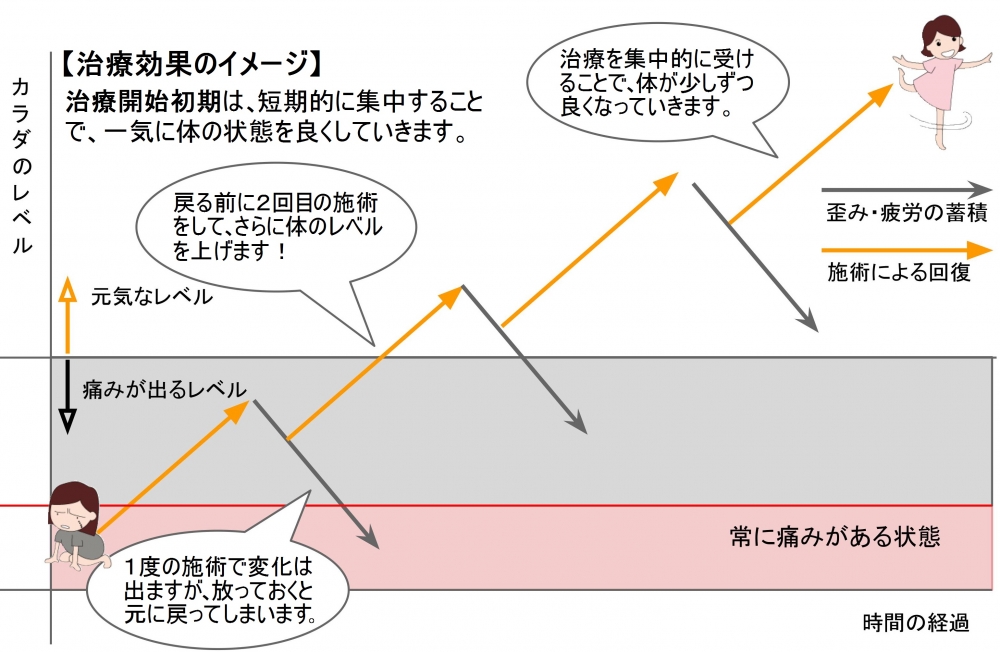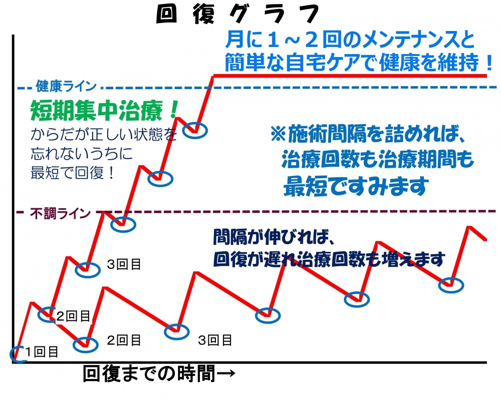 当院では、初回から 5 回目までは間隔をつめてご来院いただく「初期集中治療」を強くオススメしています。 身体が正しい状態を忘れないうちに次の施術を行う必要があるからです。