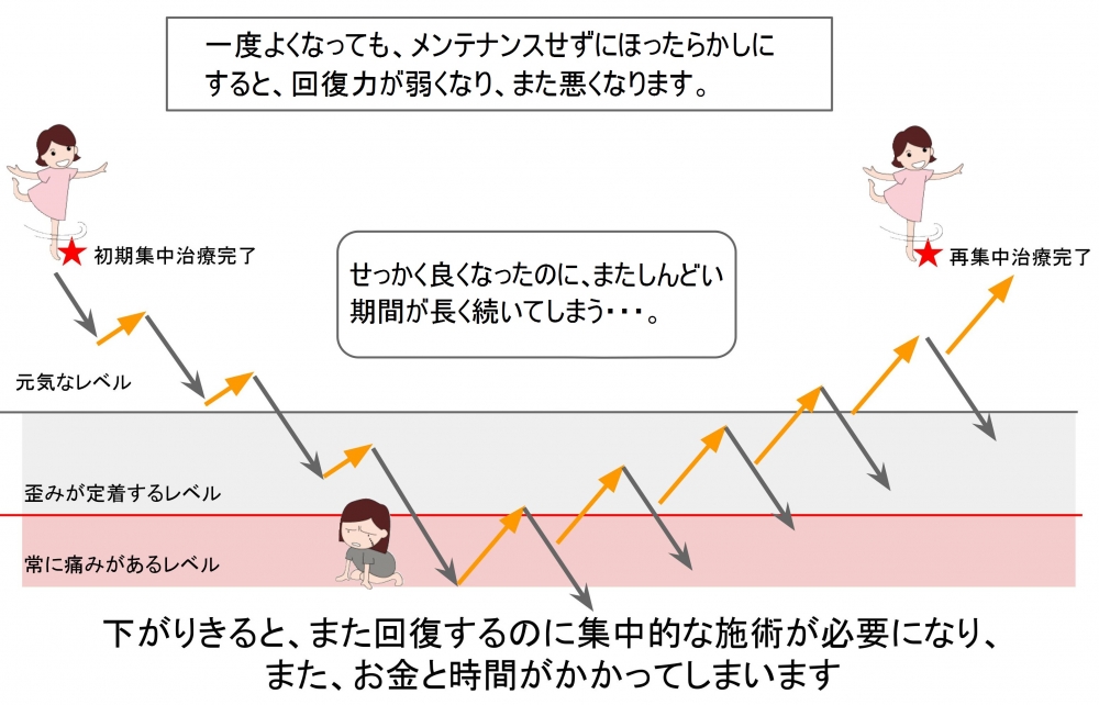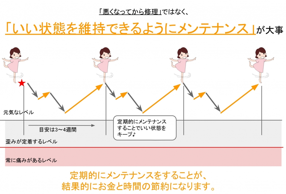 完璧なコンディションを求めることは難しいですが、メンテナンス期は体調を維持するためにも月に1~2回程度でご来院ください。