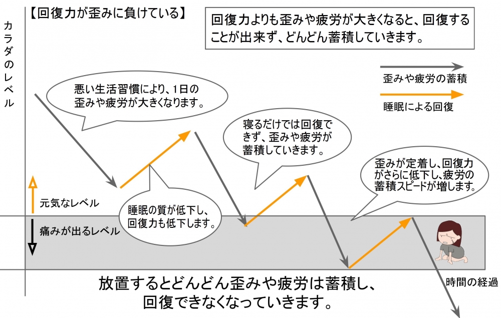 そのため、施術を受けて一度度は良い状態になっても身体が今まで慣れ親しんだ元の悪い状態に戻そうとします。