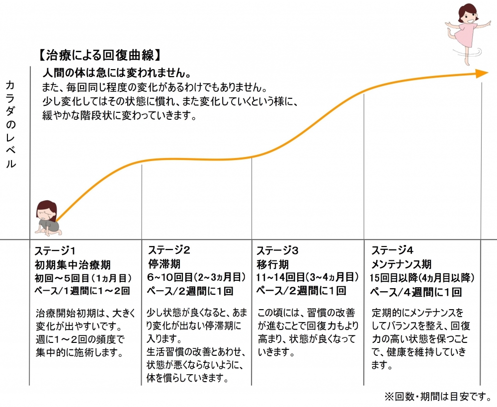 症状の原因は今までの生活習慣にある場合が多いので、 1 回だけ治療を受けても全てがすっかり改善されるわけではありません。ほとんどの場合、通院が必要となりますので適切な通院の提案をさせていただきます。