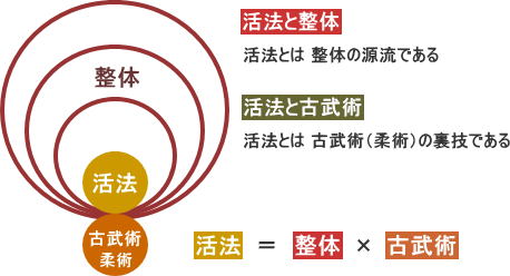 「整体」という言葉には明確な定義がないため、整体と活法の違いを説明することは簡単ではありません。しかし、活法の歴史を調べた上で整体のルーツをたどっていくと「活法」に行き着くことがわかります。そのため、「活法=整体」という考え方も成りたつ事になります。