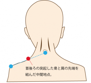首のつけ根と肩の先のちょうど中間です。押すと重たい痛みを感じるところです。