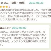 ☆ペンネーム ITSU様☆ (豊川市、40代、男性) ふくらはぎの痺れが気になり来店しました。今までは整体等でのメンテナンスでしたが針治療を受けてこれは有りだなと感じました。おかげで身体も調子よく、これからは定期でのメンテナンスをお願いしたいと思います。 しんきゅうコンパス口コミより引用    ...