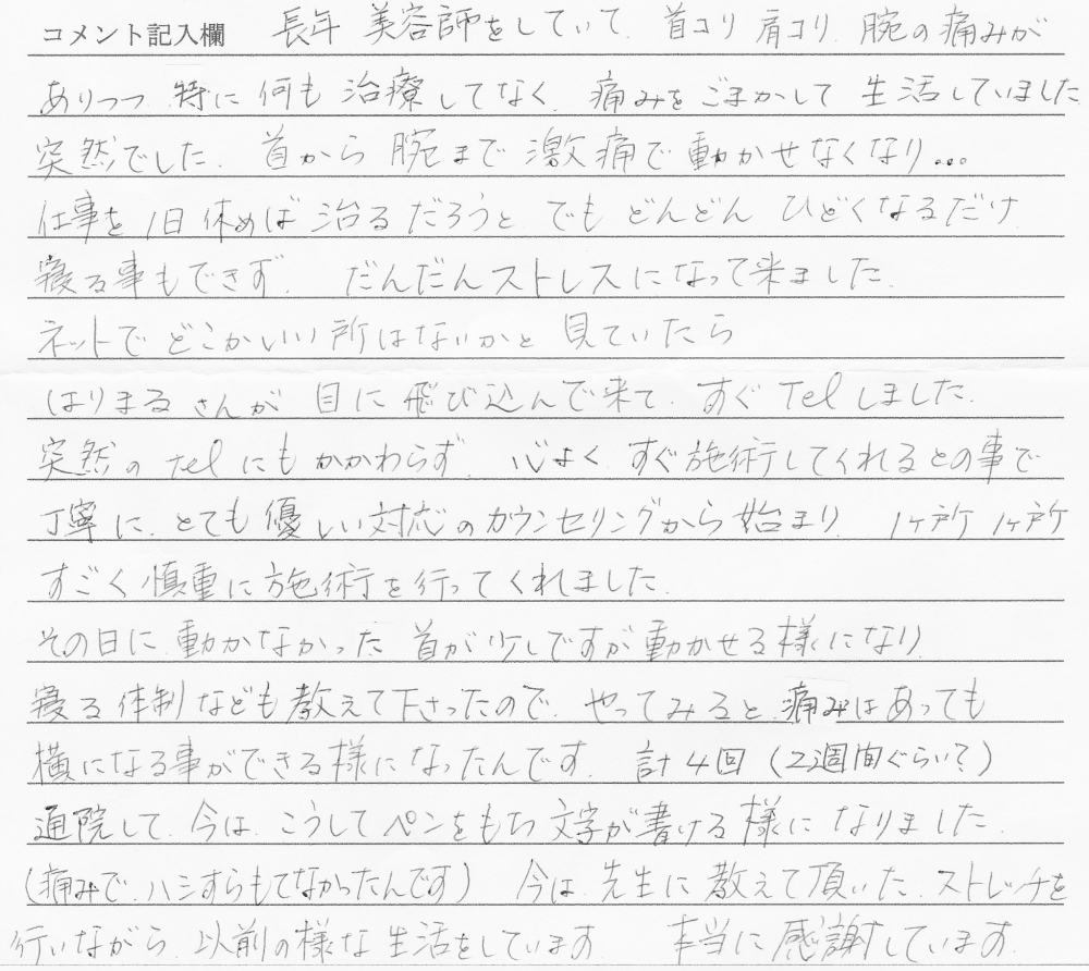 突然、首から腕まで激痛で動かせなくなり…(豊川市、48歳、女性) イニシャル H.N様 48歳、女性 愛知県 豊川市 頸(首)痛 , 肩こり , 肩痛 2016/10/27 ☆イニシャル H.N様☆(豊川市、48歳、女性) 長年、美容師をしていて、首コリ、肩コリ、腕の痛みがありつつ、特に何も治療してなく、痛みをごまかして生活していました。突然でした。首から腕まで激痛で動かせなくなり・・・。仕事を1日休めば治るだろうと、でもどんどんひどくなるだけ、寝ることもできず、だんだんストレスになってき... 詳細を見る »