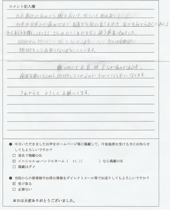 腕を前にも後ろにも組めず(豊川市、50代、女性) イニシャル M.H様 50代、女性 愛知県 豊川市 頸(首)痛 , 肩こり , 肩痛 2017/04/04 ☆イニシャル M.H様☆(豊川市、50代、女性) 左肩周辺の痛みから、腕を前にも後ろにも組めず、仕事や家事でも痛みがあり、友達から鍼の良さを聞き、家か会社から近くで通える所をネットで探し、はりまるさんの口コミとかを見て通うことをきめました。 何回かの施術で腕を組めるようになり、今では定期的に施術をして再発しないようにし... 詳細を見る »