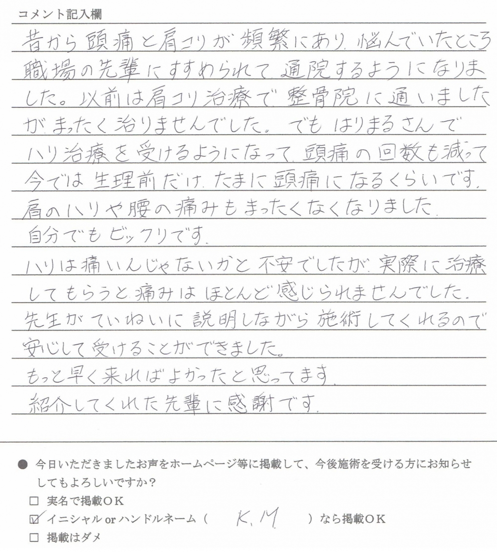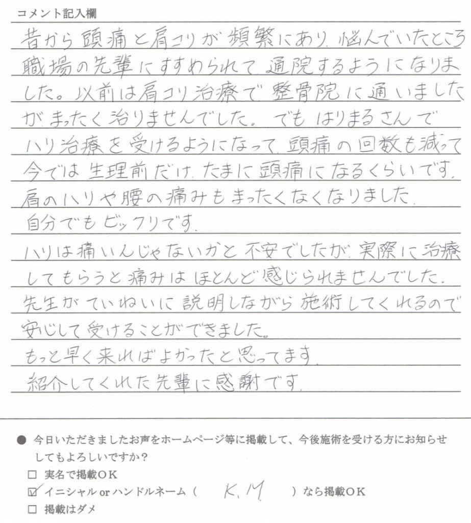 昔から頭痛と肩こりが頻繁にあり、悩んでいたところ、職場の先輩に薦められて通院するようになりました。以前は肩こり治療で整骨院に通いましたが、まったく治りませんでした。でも、はりまるさんで鍼治療を受けるようになって、頭痛の回数が減って、今では生理前だけ、たまに頭痛になるくらいです。肩のハリや腰の痛みもまったくなくなりました。自分でもビックリです。