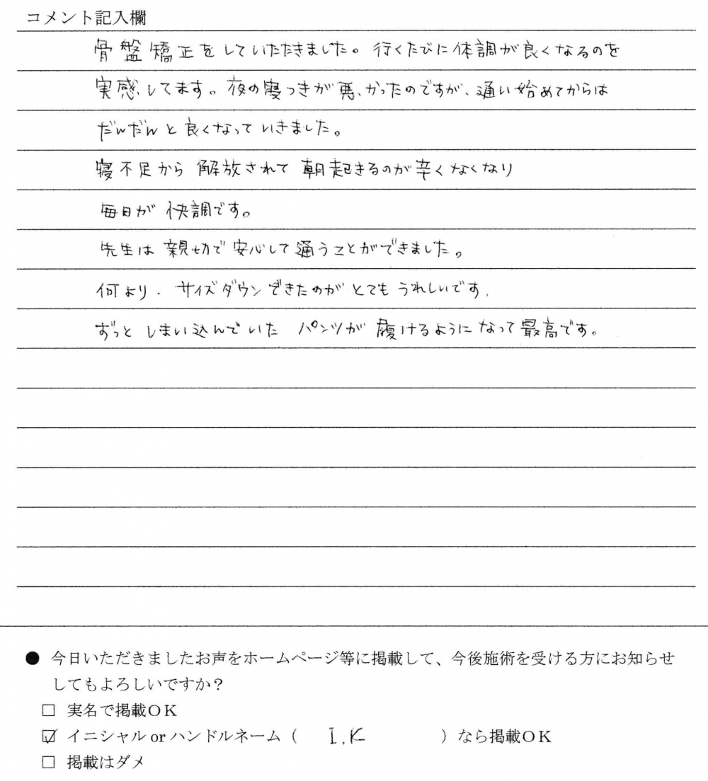 骨盤矯正をしていただきました。行くたびに体調が良くなるのを実感しています。夜の寝つきが悪かったのですが、通い始めてからは、だんだんと良くなっていきました。寝不足から解放されて朝起きるのが辛くなくなり、毎日が快調です。先生は親切で安心して通うことができます。何より、