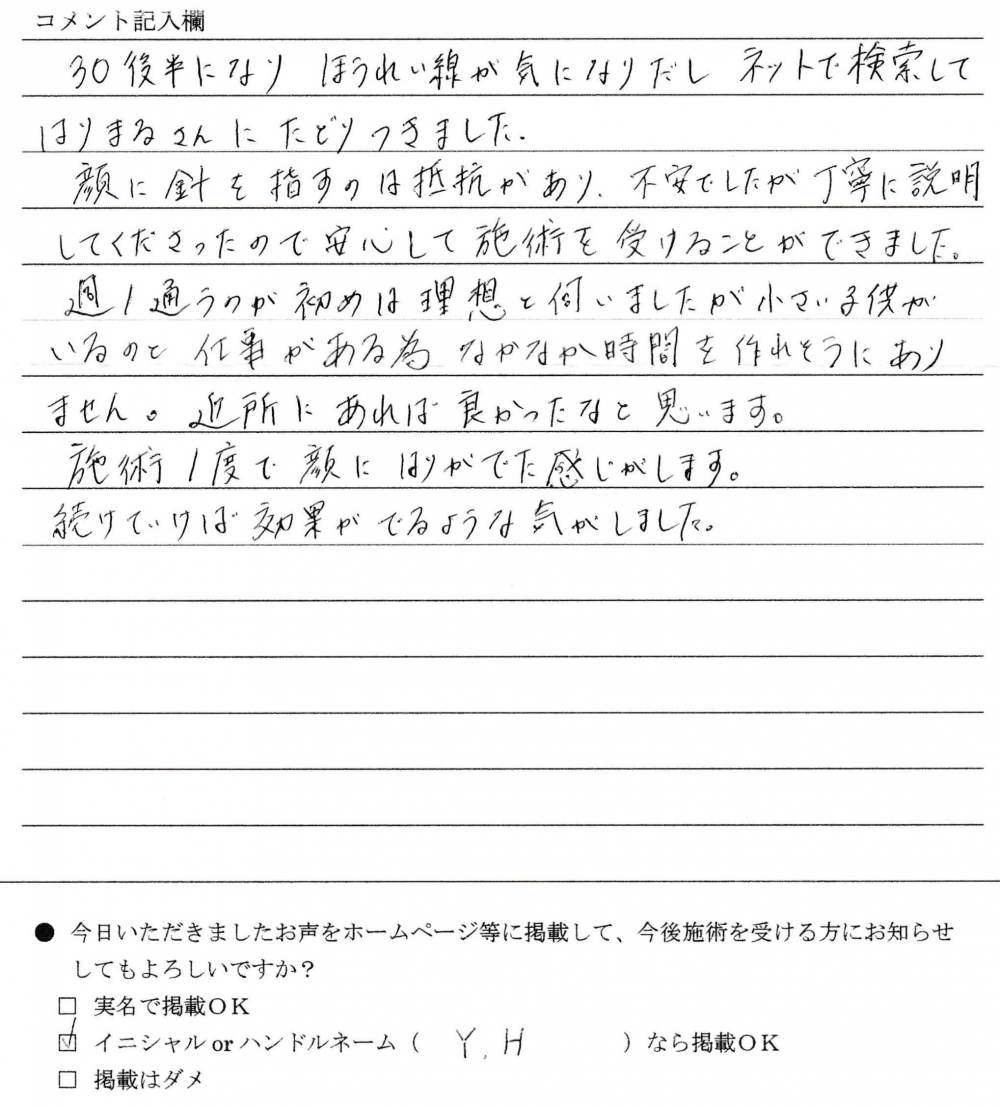 30代後半になり、ほうれい線が気になりだし、ネットで検索してはりまるさんにたどりつきました。