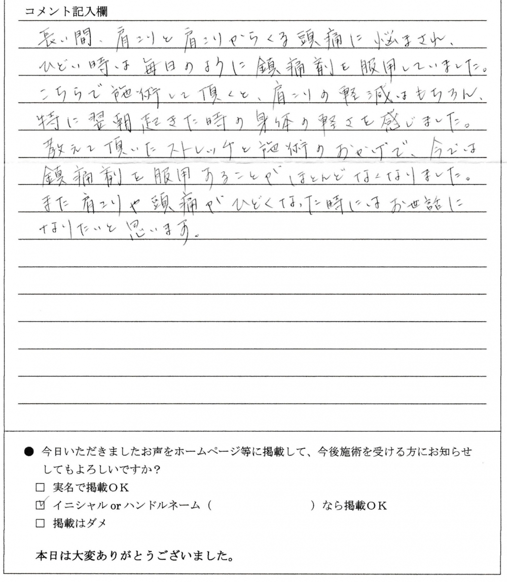 教えて頂いた日常のストレッチと施術のおかげで、今では鎮痛剤を服用することがほとんどなくなりました。また肩こりや頭痛がひどくなった時にはお世話になりたいと思います。