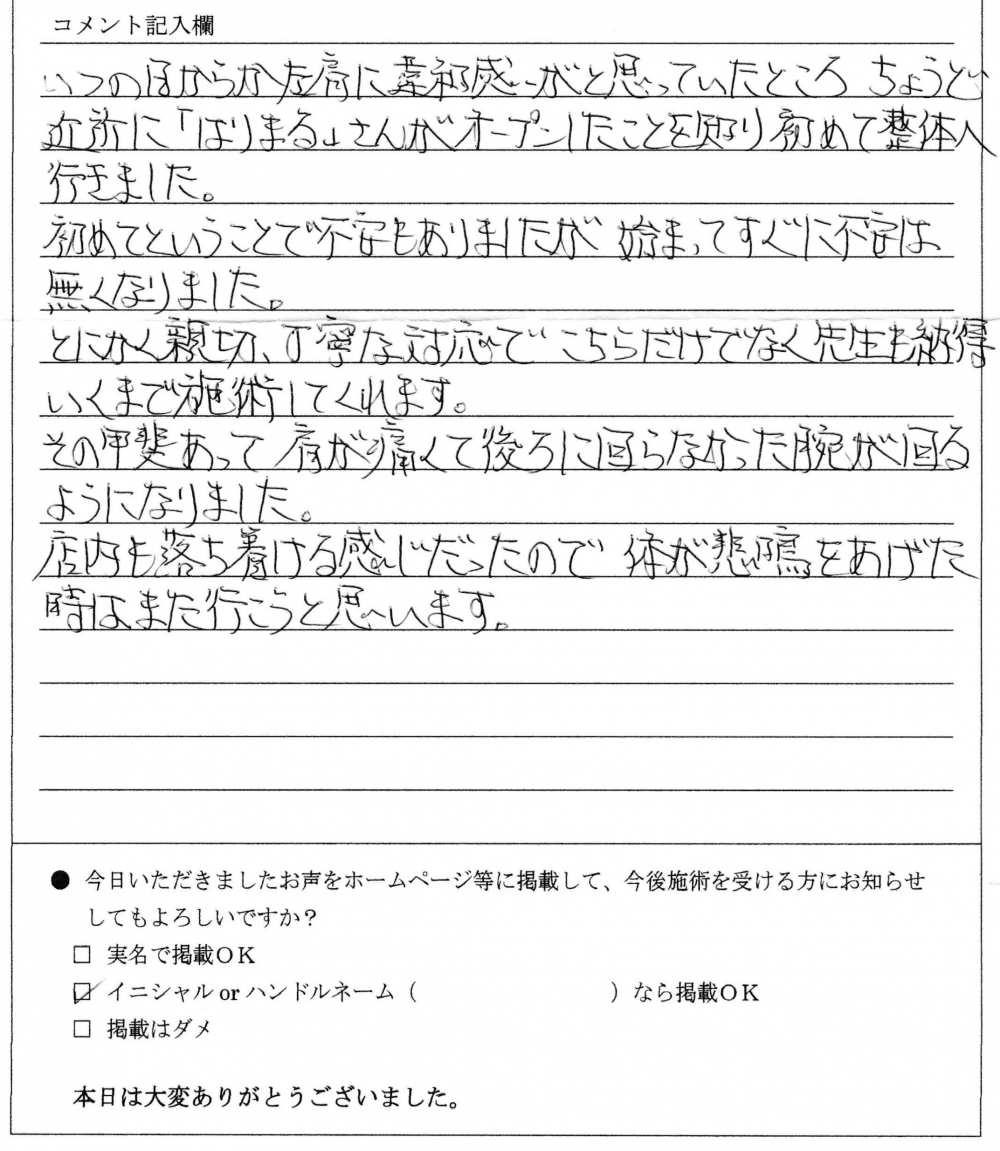 いつの日からか左肩に違和感がと思っていたところ ちょうど近所に「はりまる」さんがオープンしたことを知り 初めて整体へ行きました。