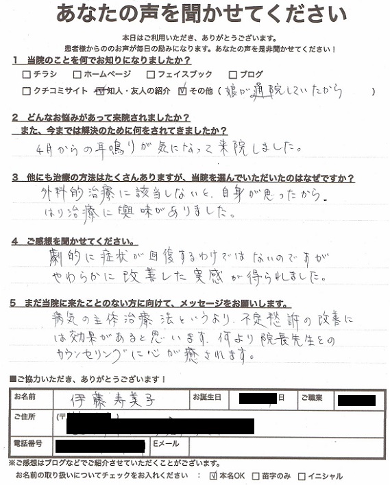 四月から耳鳴りが気になっていました。自分自身、外科的治療に該当しないと思っていたし、はり治療にも興味がありました。娘が通院していたこともあり通院することにしました。