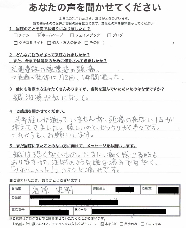 半年ほどしか通っていませんが、頭痛の来ない一日が増えてきました。