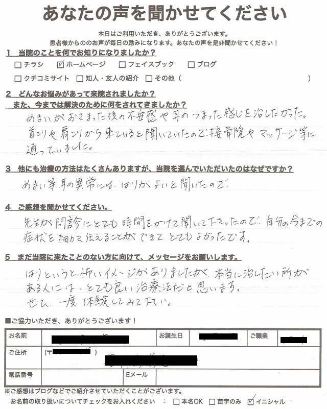 めまいがおさまった後の不安感や耳のつまった感じを治したくて来院しました。