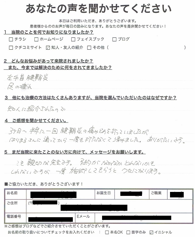 左手首の腱鞘炎で、三ヶ月~半年に一回、腱鞘炎の痛み止めの注射を打っていましたが、知人に紹介されて「はりまる」の鍼治療に通ってみることにしました。