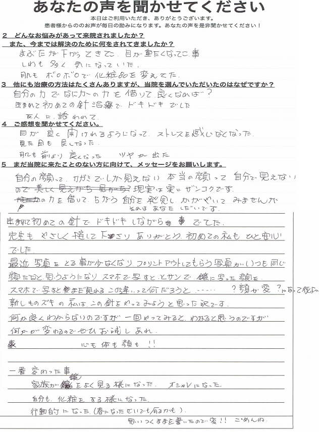 目が良く開けれるようになって、ストレスを感じなくなりました。見た目も良くなり、肌も前より良くなりました。ツヤも出ました。