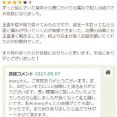 肩こり、首こりが気になり(豊川市、30代、男性) イニシャル T.K様 30代、男性 愛知県 豊川市 頸(首)痛 , 肩こり 2018/03/12 ☆イニシャル T.K様☆(豊川市、30代、男性) 肩や首にこりがあり、仕事をしている時や普段の生活で気になる状況だった為、来院しました。 最初のキッカケは鍼灸ネットで検索して、当院のサイトを見て決めました。サイトの案内がとてもわかりやすく、針治療だけではなく整体も行っていただける所に引かれました。 先生がとても親身にな... 続きを読む »